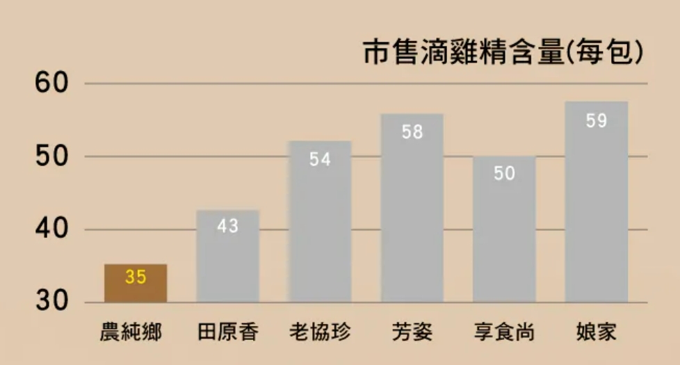 以農純鄉為例,滴雞精是用100%土雞提煉,富含支鏈胺基酸(397mg/100ml),蛋白質含量每100ml也有7.7g,鈉含量跟田原香、老協珍等品牌相比,為業界最低。