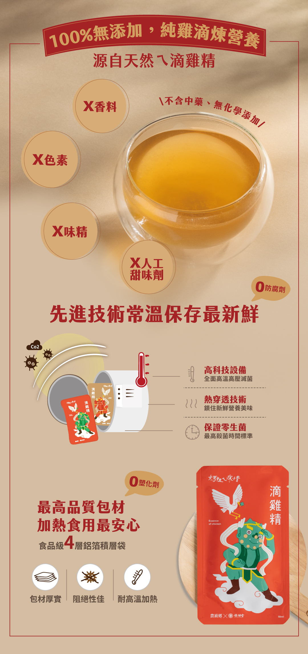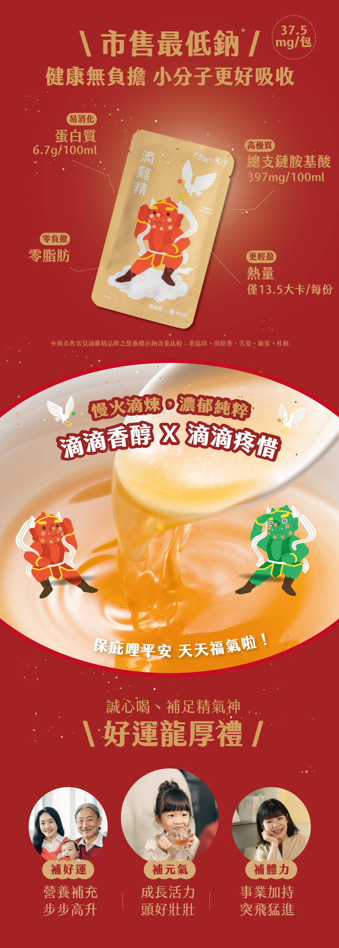 不摻一滴水,只取第一道初淬精華,滿滿蛋白質與胺基酸營養,零脂肪無負擔,市售滴雞精最低鈉,最適合照顧全家人健康,送禮最推薦!