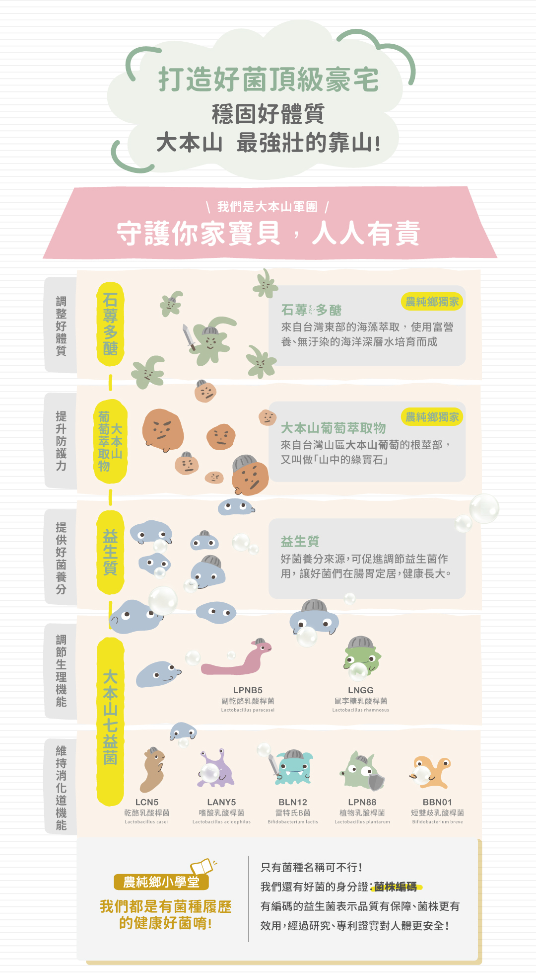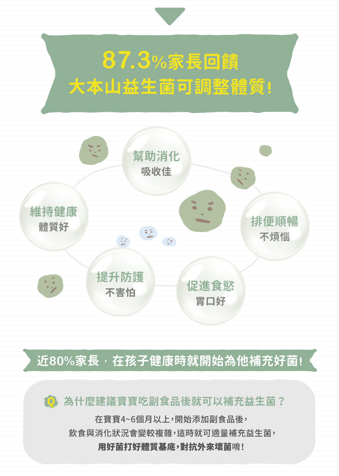 6 個月以上適用/專為嬰幼兒開發 / 調整體質 / 維持消化道機能 / 改變細菌叢生態