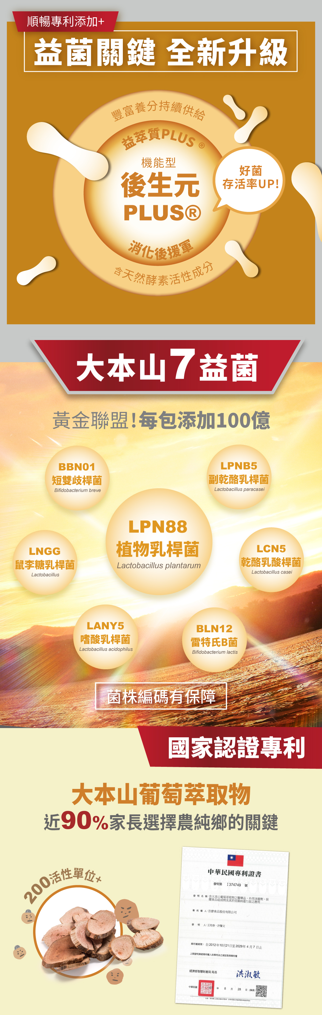 6個月以上適用 / 大本山7益菌 X 順暢專利後生元+
