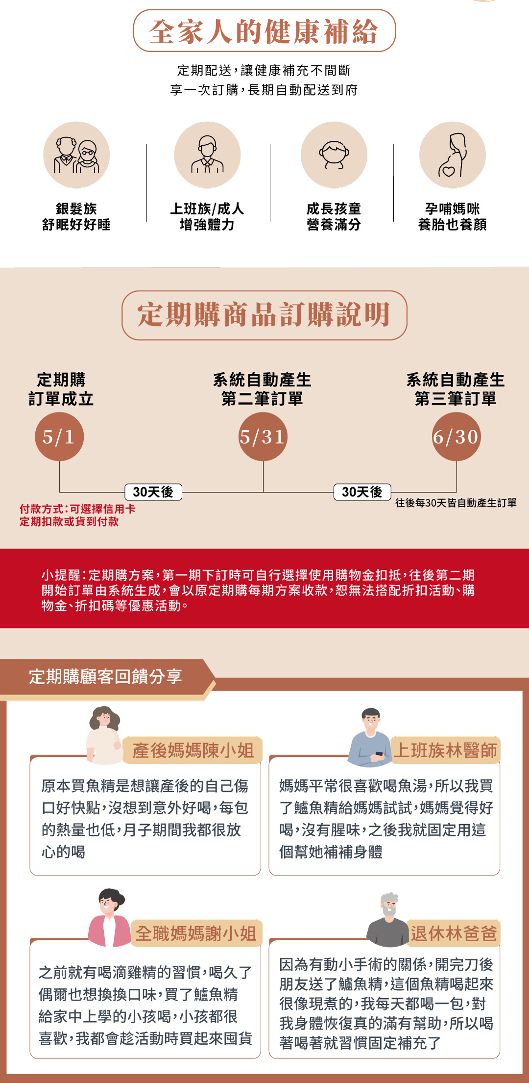 ● 每 30 天自動配送 20 包燕窩鱸魚精,享台灣本島免運優惠