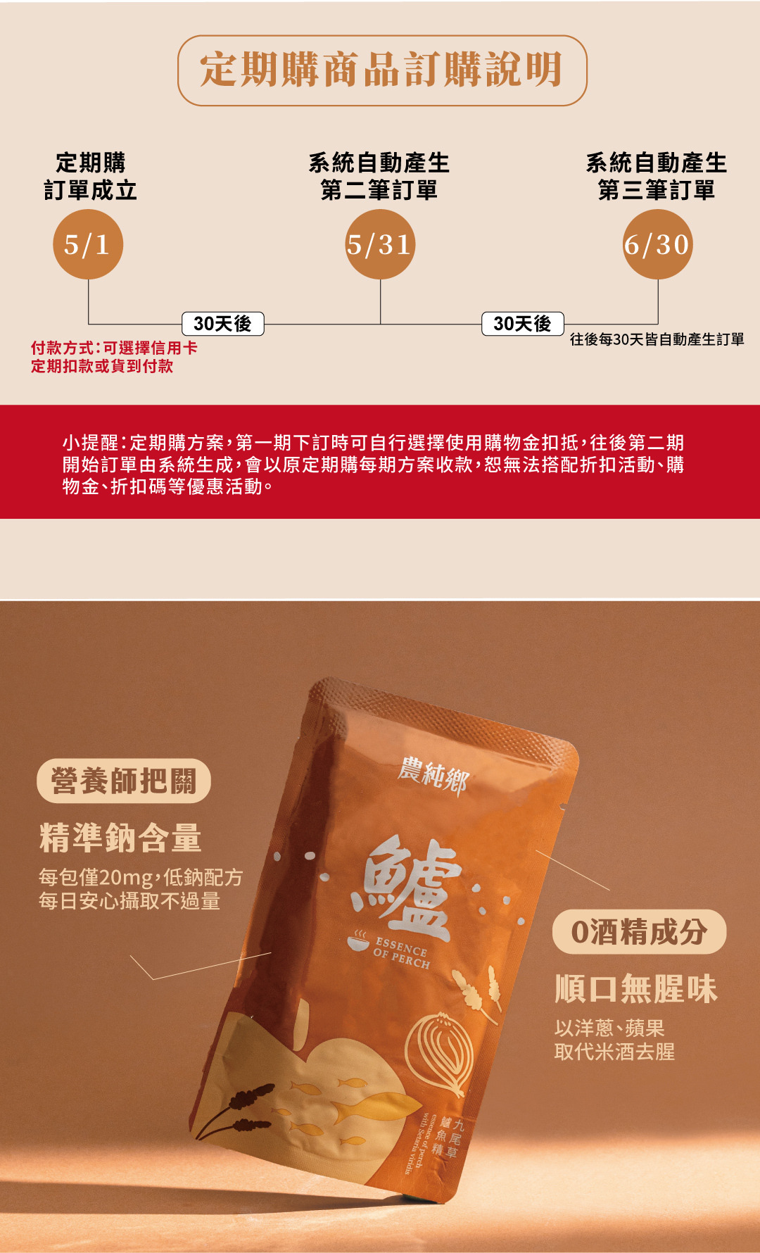 ● 每 30 天自動配送 20 包九尾草鱸魚精,享台灣本島免運優惠