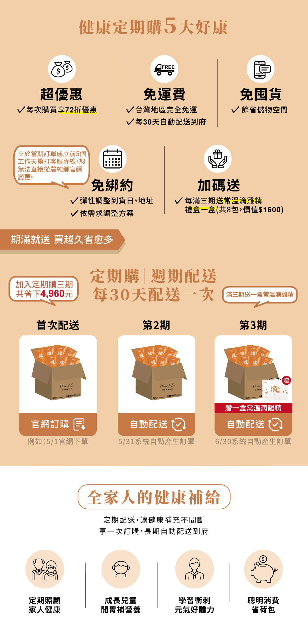 所有定期購商品,【滿3期】贈「農純鄉 滴雞精禮盒 (價值$1,600)」