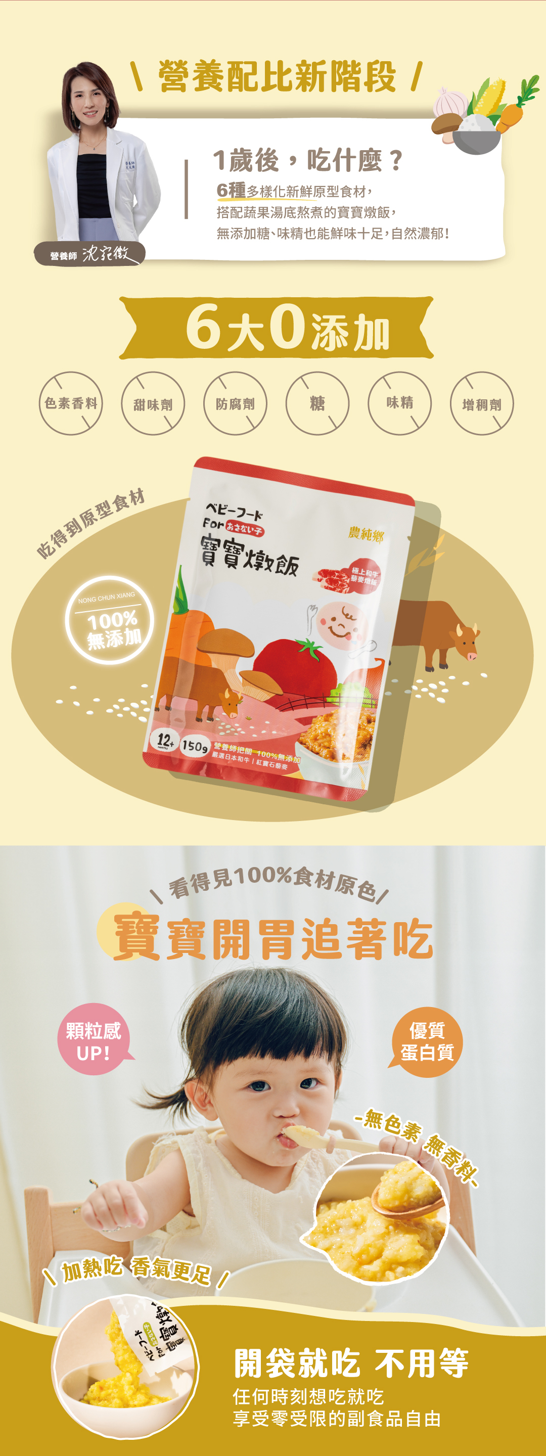 適合1歲up的寶寶燉飯,顆粒感升級/日本極上和牛+台灣牛,豪邁食材新升級/1餐1袋份量剛剛好,常溫設計開袋即食不用等/100%不使用香料、色素、甜味劑