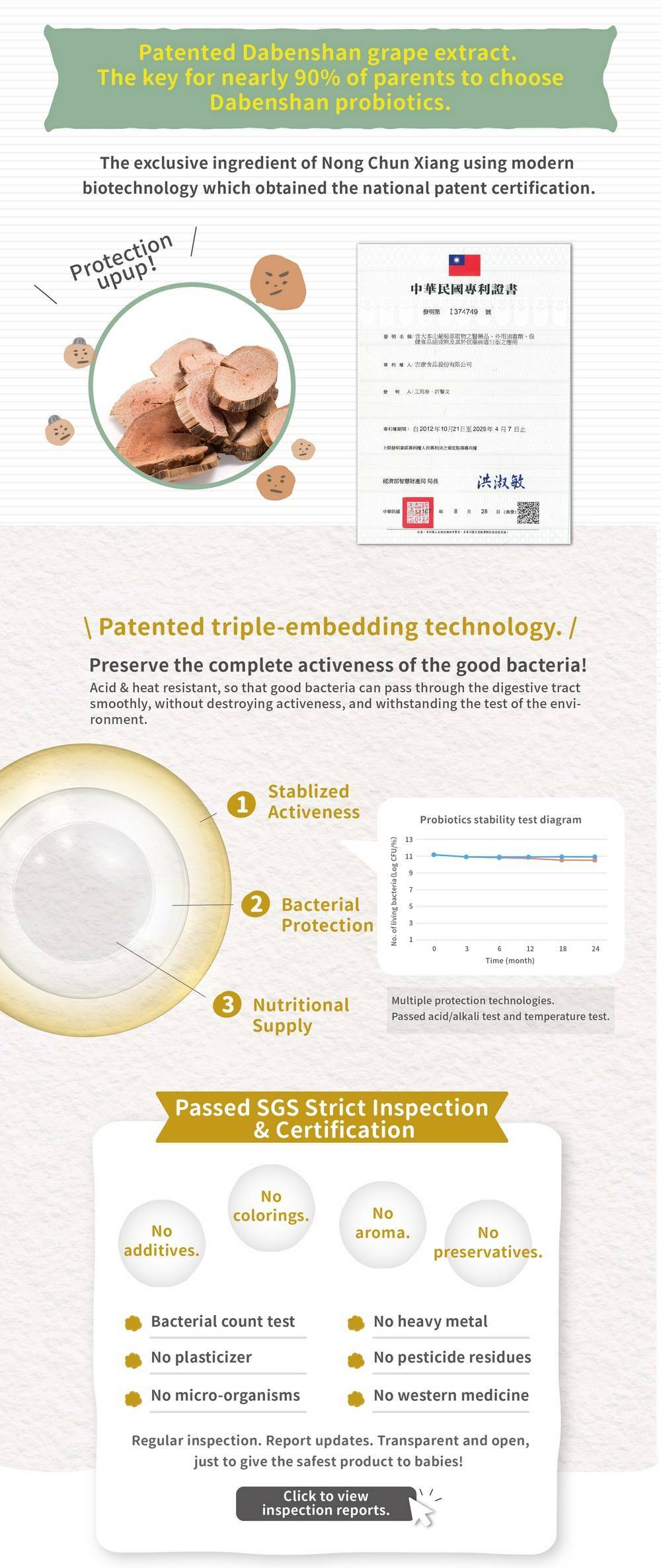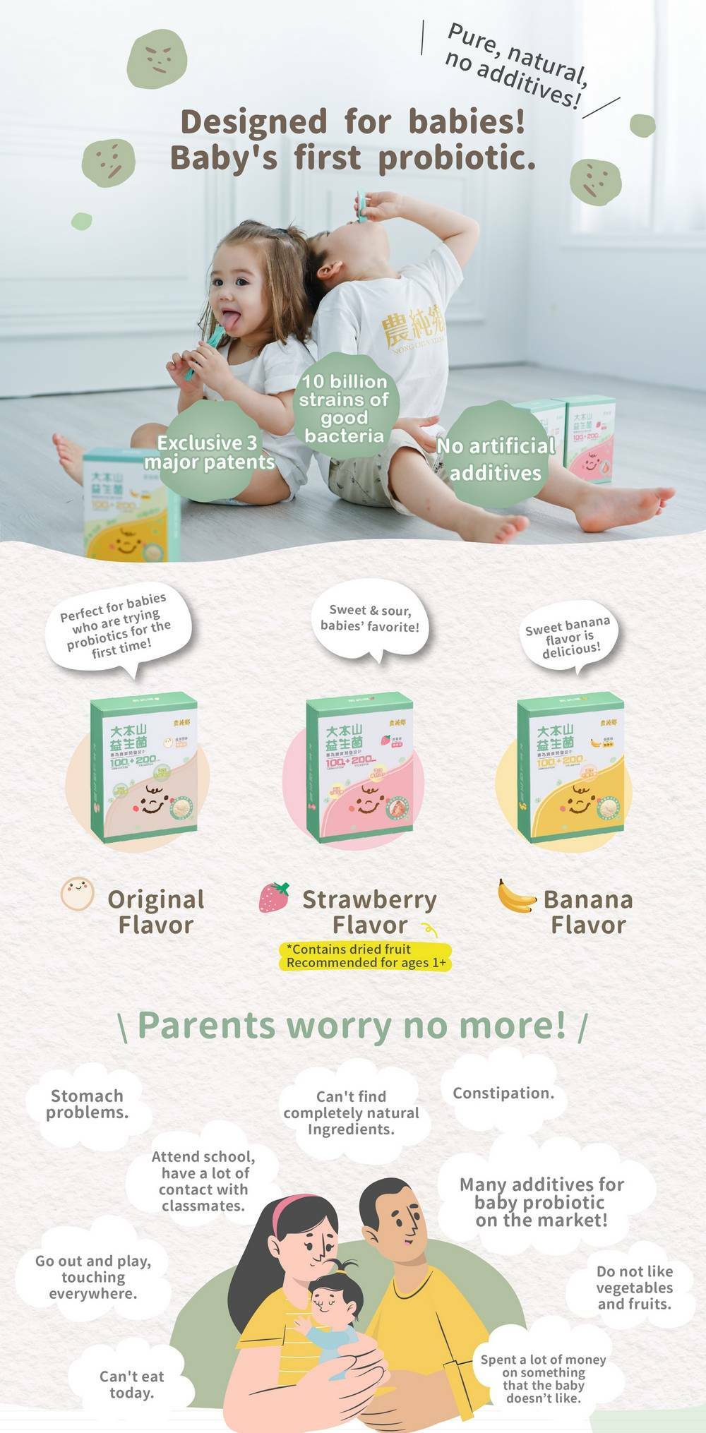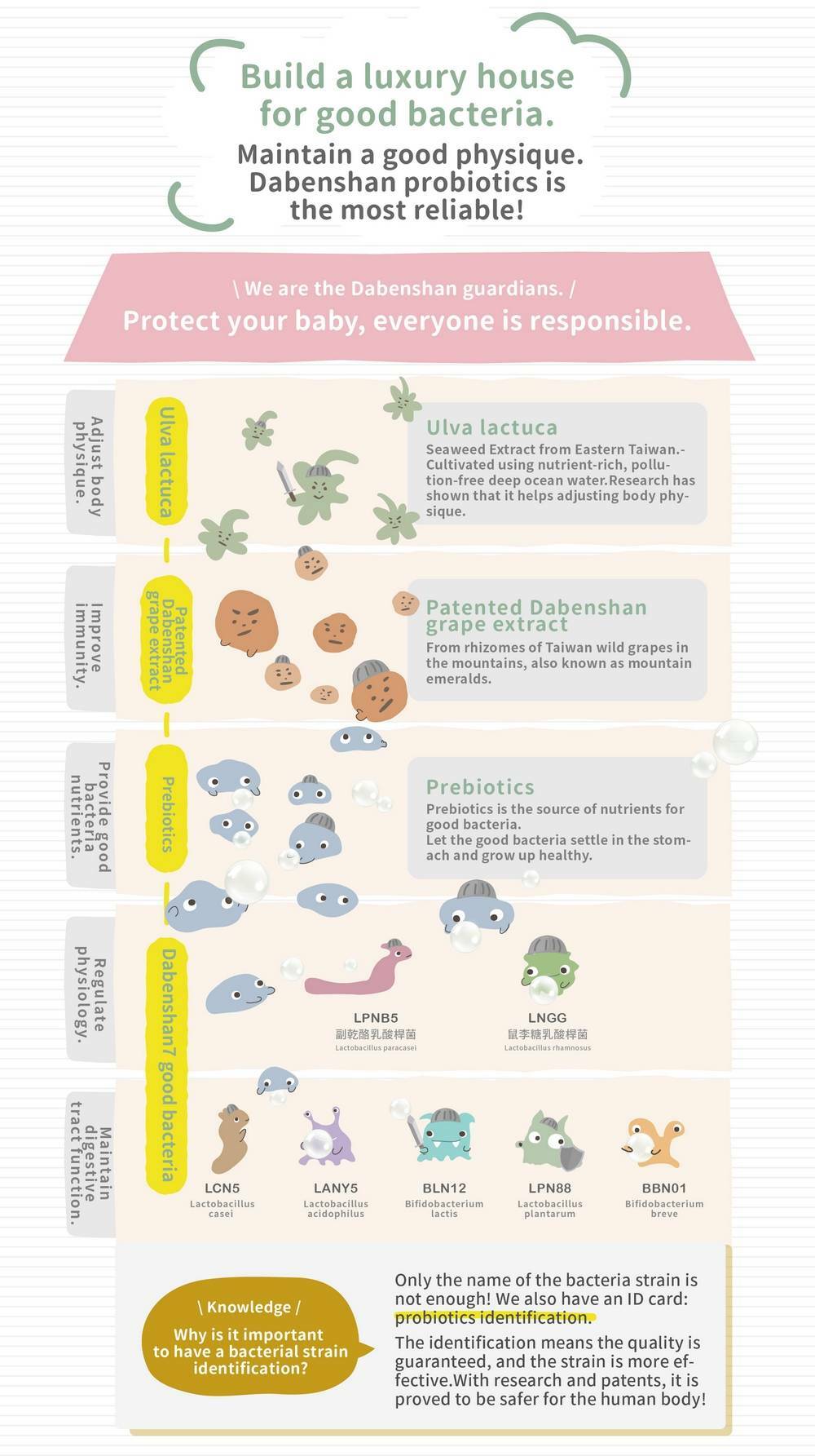 Ingredients: cornstarch, sugar, Dabenshan Grape Extract ABT1001 (Dabenshan Grape Extract, Maltodextrin), Banana juice powder (maltodextrin, freeze-dried banana chips)、Dabenshan 7 Beneficial Bacteria (Lactobacillus casei, Lactobacillus plantarum) Lactobacillus rhamnosus, Lactobacillus paracasei, Bifidobacterium lactis, Bifidobacterium breve, Lactobacillus acidophilus), Inulin, Strawberry, Skim milk powder, Vitamin C, xylo-oligosaccharide, Ulva lactuca