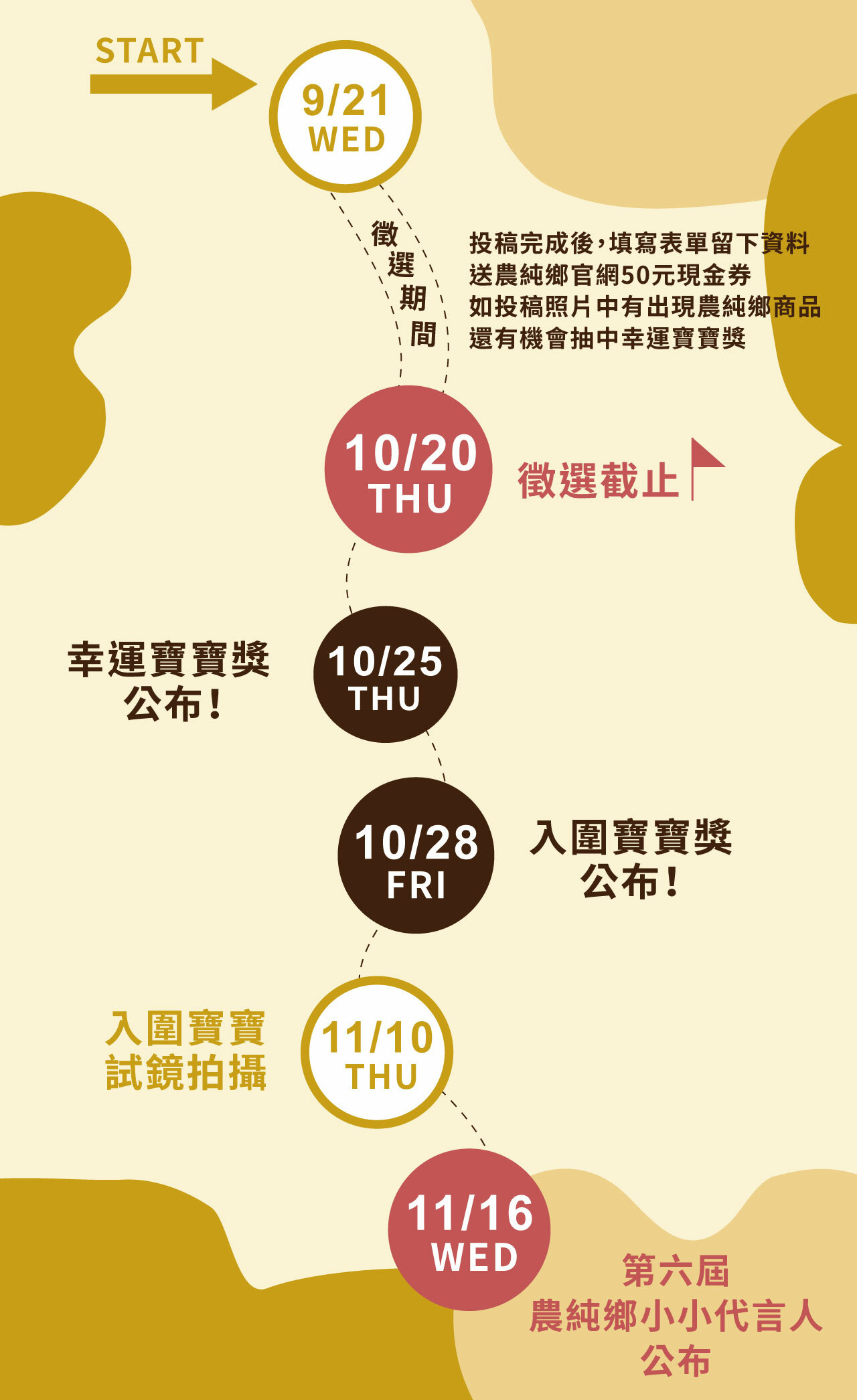 試鏡結束後,農純鄉將依照試鏡當天狀況與照片,以投票形式複選出 6 位農純鄉小小代言人,將以Email通知並寄出產品,之後再約正式拍攝時間與地點。