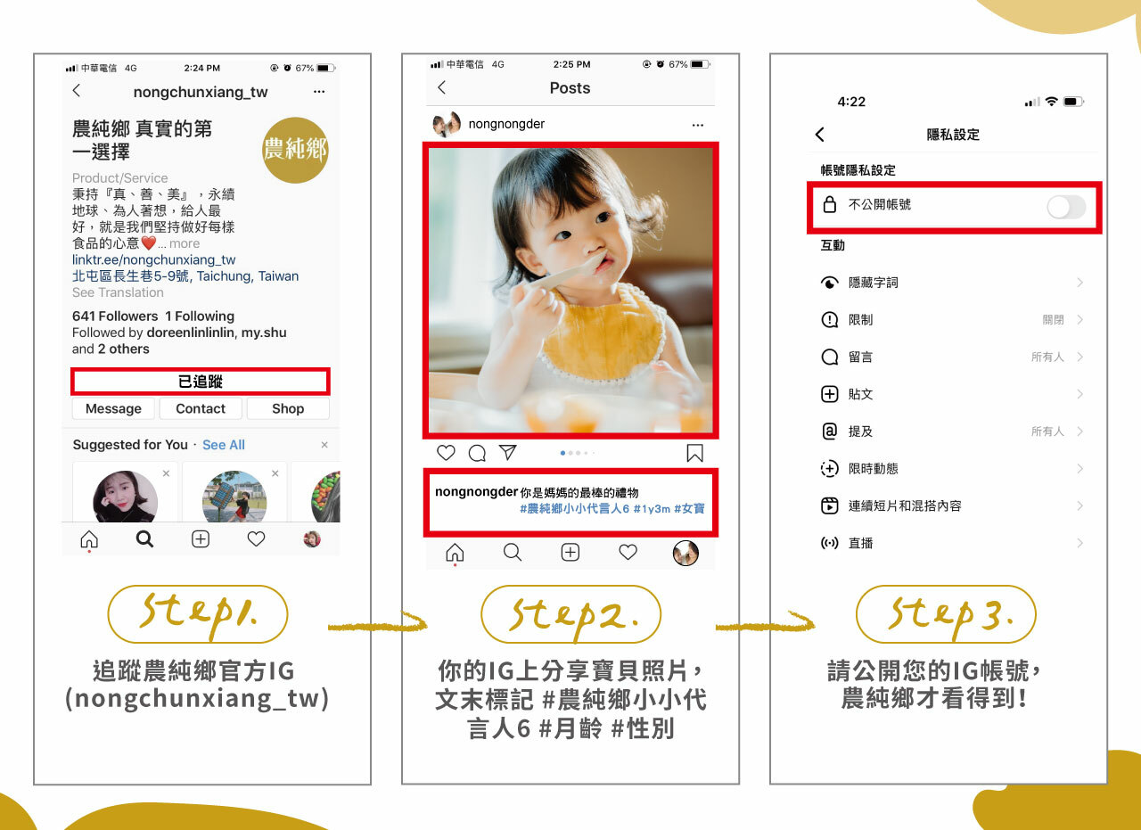 Step2 在你的個人 IG 上傳貼文,文末標記 #農純鄉小小代言人6 #月齡 #性別 (ex. #農純鄉小小代言人6 #1y3m #女寶)