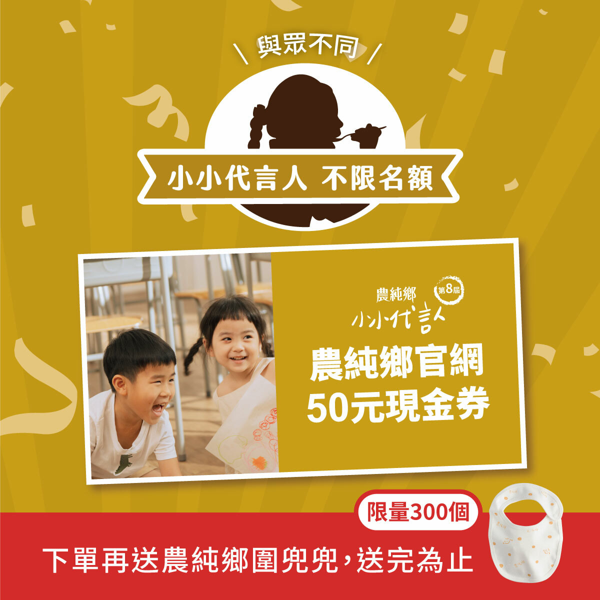 憑折扣碼最快下單加碼再送「農純鄉超稀有圍兜兜」,限量 300 份,只送不賣、要搶要快!