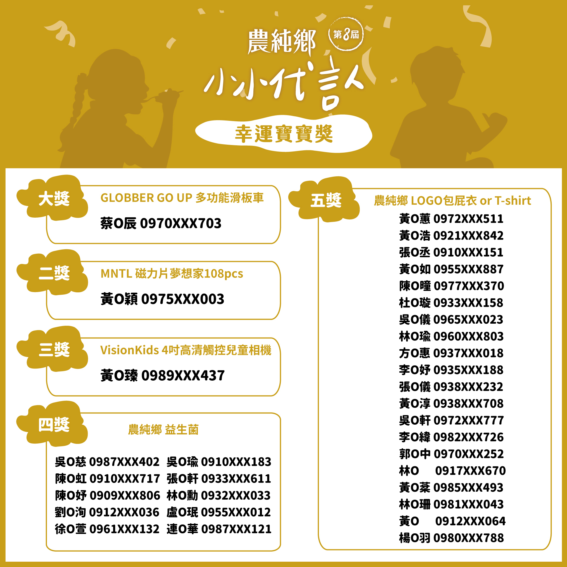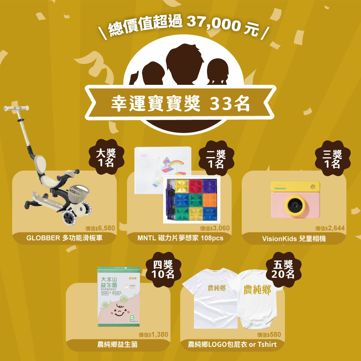 ● 大獎、二獎、三獎、四獎獎品將於 8/16(五)前寄出;五獎獎品「農純鄉 包屁衣 or 兒童短T」預計9月底前寄出。