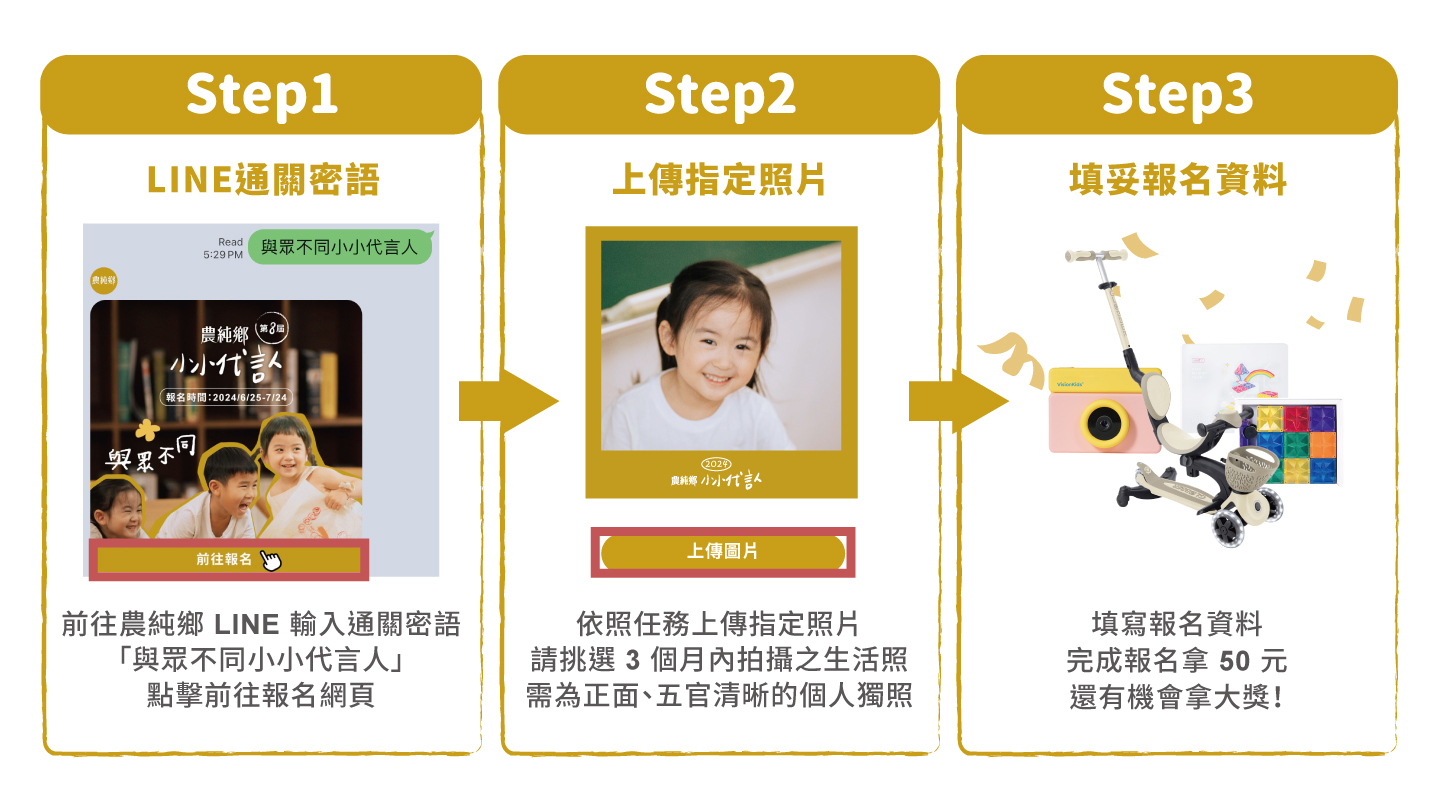 A:加入農純鄉 LINE 好友,或於農純鄉官方 LINE 輸入關鍵字「與眾不同小小代言人」後,點擊前往報名網頁,依照指示上傳照片並填寫報名表就完成報名囉!