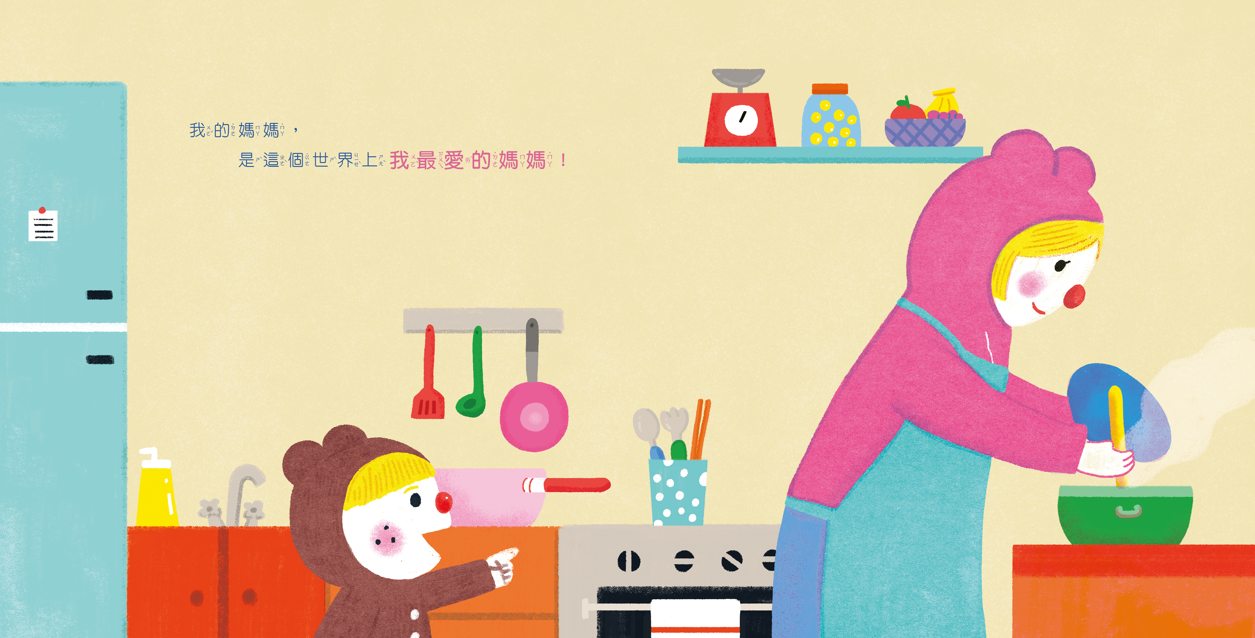 咚東:整個繪畫歷程大約花了兩個多月的時間。這次的繪本故事是圍繞在媽媽與孩子的陪伴,而最難的就是如何讓畫面在溫暖中仍保有真實情感。印象最深的是其實一開始角色是以人型的狀態設計,但反覆調整後,覺得可以加入更多「咚東」風格的圖像元素,讓這本書更可以代表自己,對於最後繪本的呈現我覺得十分喜歡。
