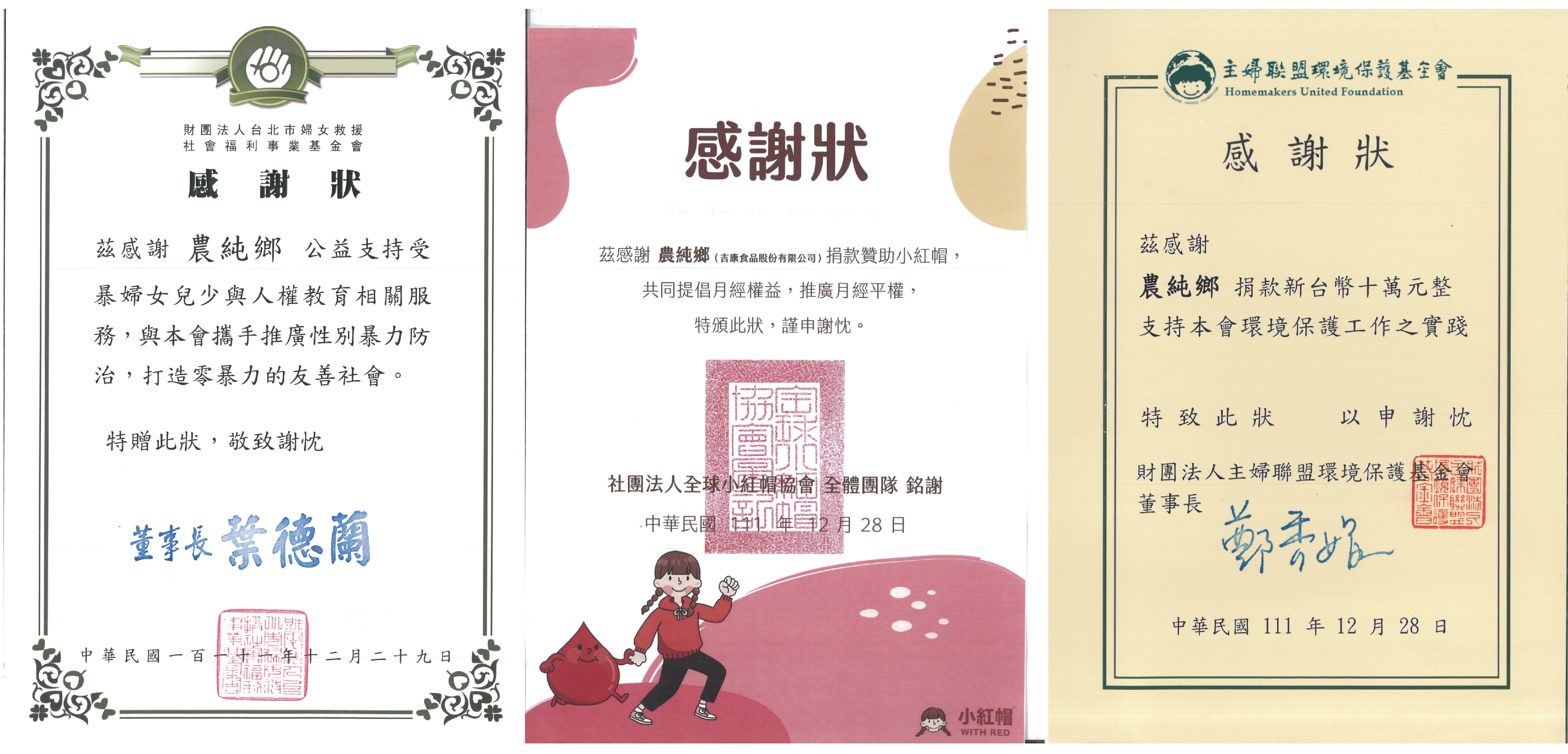 2022歲末年終,農純鄉延續了關懷女性議題,響應至公益回饋,發起「溫暖,永不過期」公益計畫,將年度盈餘提撥總金額70萬元至7大婦女公益團體組織,包含各種社會與健康議題:女性癌症、性別平等、失婚、單親媽媽、受暴婦女、二度就業、月經平權、多元家庭等,在不同層面的女性議題上,為社會共同努力。