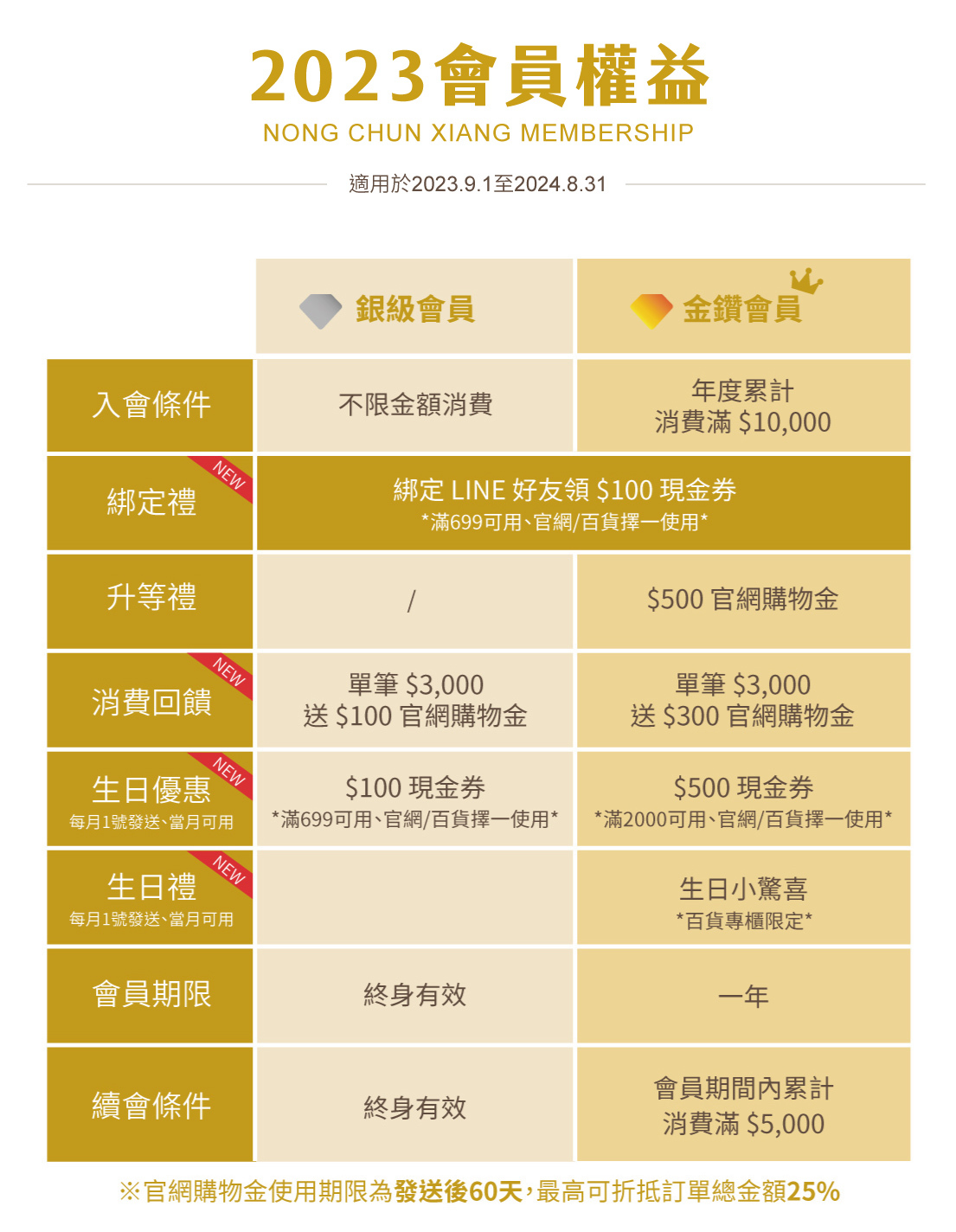 ※此會員權益適用於 2023 年 9 月 1 日至 2024 年 8 月31 日,農純鄉保留隨時變更各項會員權益的權利,依網站公告為準