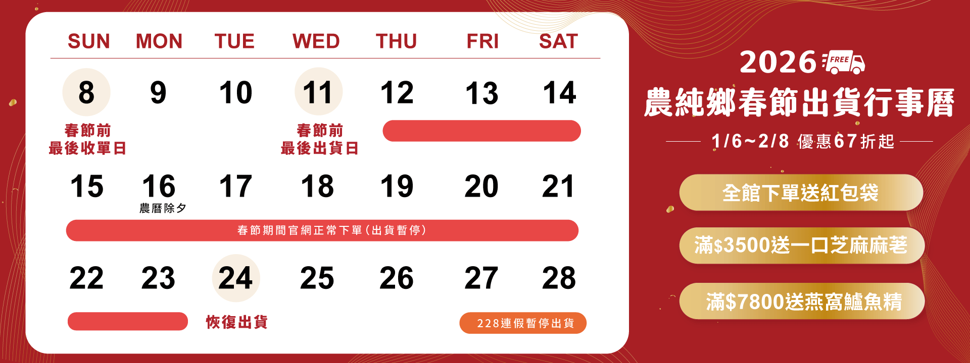 ▶ 2026/2/14 (六) – 2/22 (日) 春節連續假期