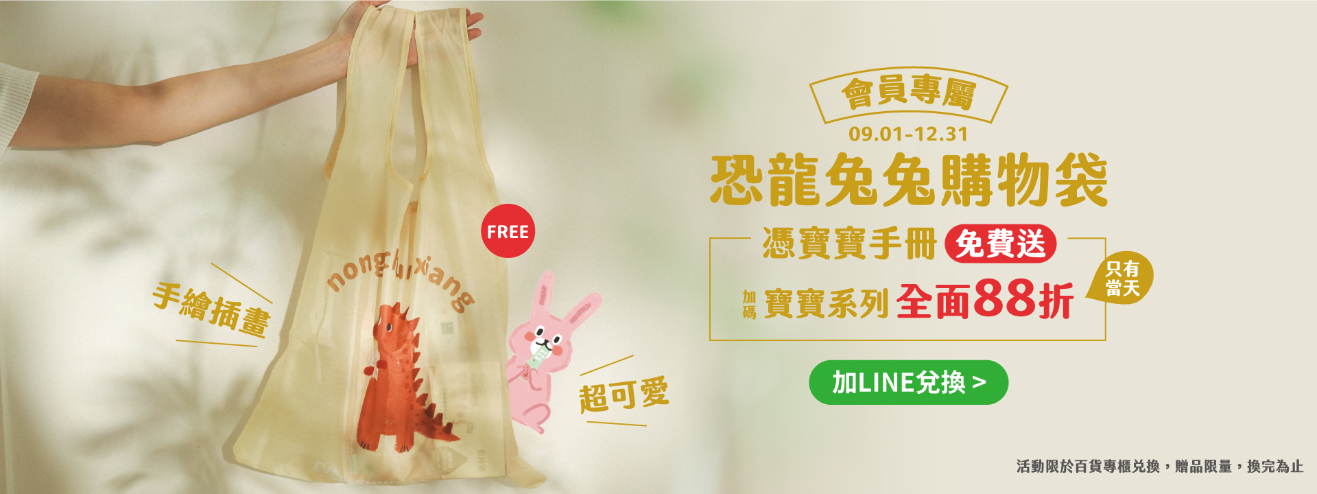 2. 至任一間百貨專櫃,出示寶寶手冊、「恐龍兔兔購物袋」電子兌換券即可兌換。