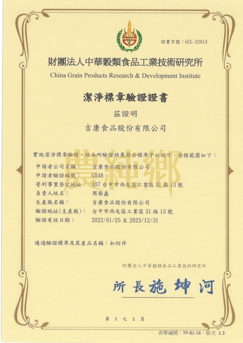 100%無添加潔淨標章驗證證書