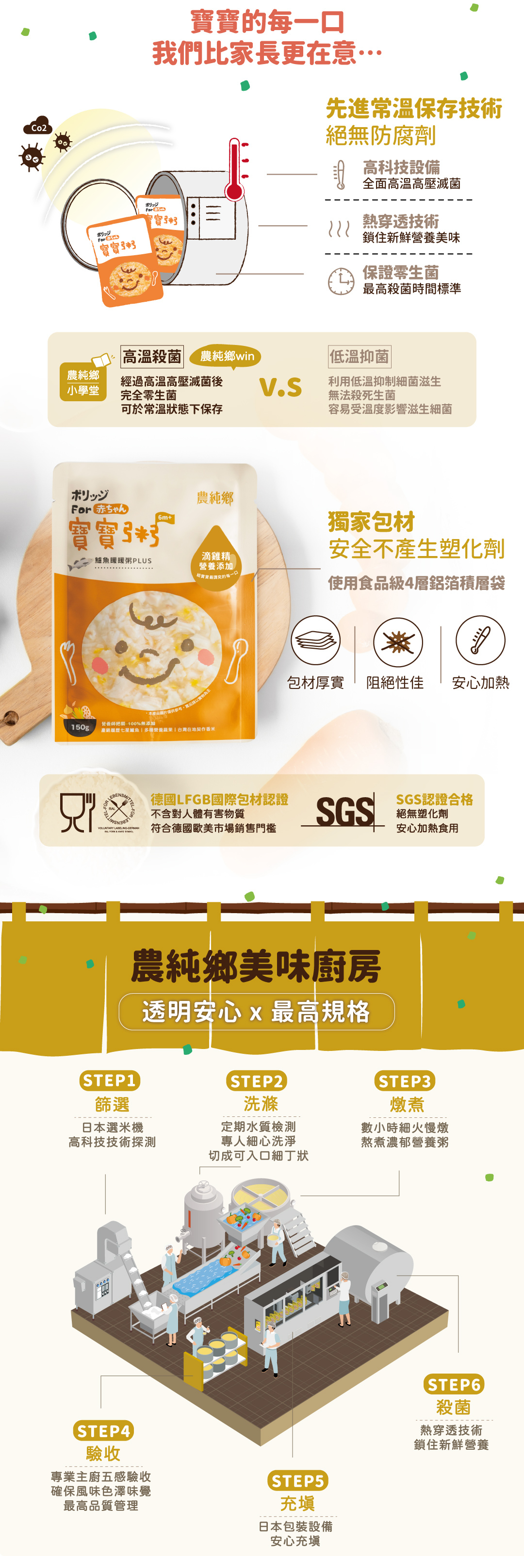 ※ 本產品無添加防腐劑,採用食品級鋁箔積層袋密封包裝,能充分阻隔空氣及細菌入侵,經高壓滅菌製程,不必添加防腐劑即能常溫保存,是最安全的包裝食品,請安心享用