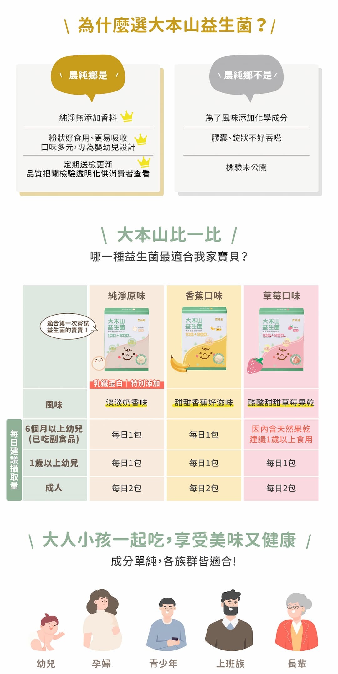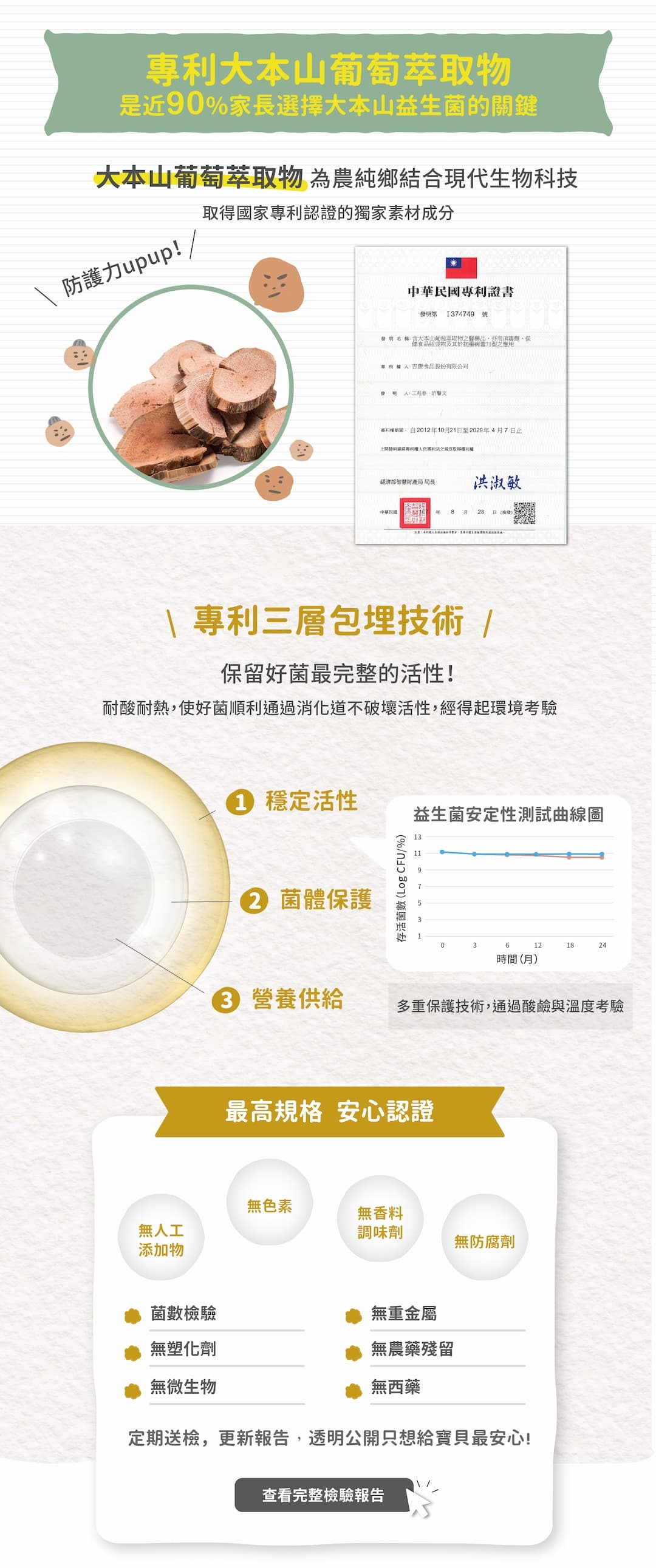 成份:玉米澱粉、細砂糖、大本山葡萄萃取物ABT1001(大本山葡萄萃取物、麥芽糊精)、草莓果汁粉(草莓濃縮汁、麥芽糊精)、大本山七益菌(乾酪乳酸桿菌Lactobacillus casei、植物乳桿菌Lactobacillus plantarum、鼠李糖乳桿菌Lactobacillus rhamnosus、副乾酪乳桿菌Lactobacillus paracasei、雷特氏B菌Bifidobacterium lactis、短雙歧桿菌Bifidobacterium breve、嗜酸乳桿菌Lactobacillus acidophilus)、菊糖、草莓果粒、脫脂奶粉、維生素C、木寡糖、石蓴多醣