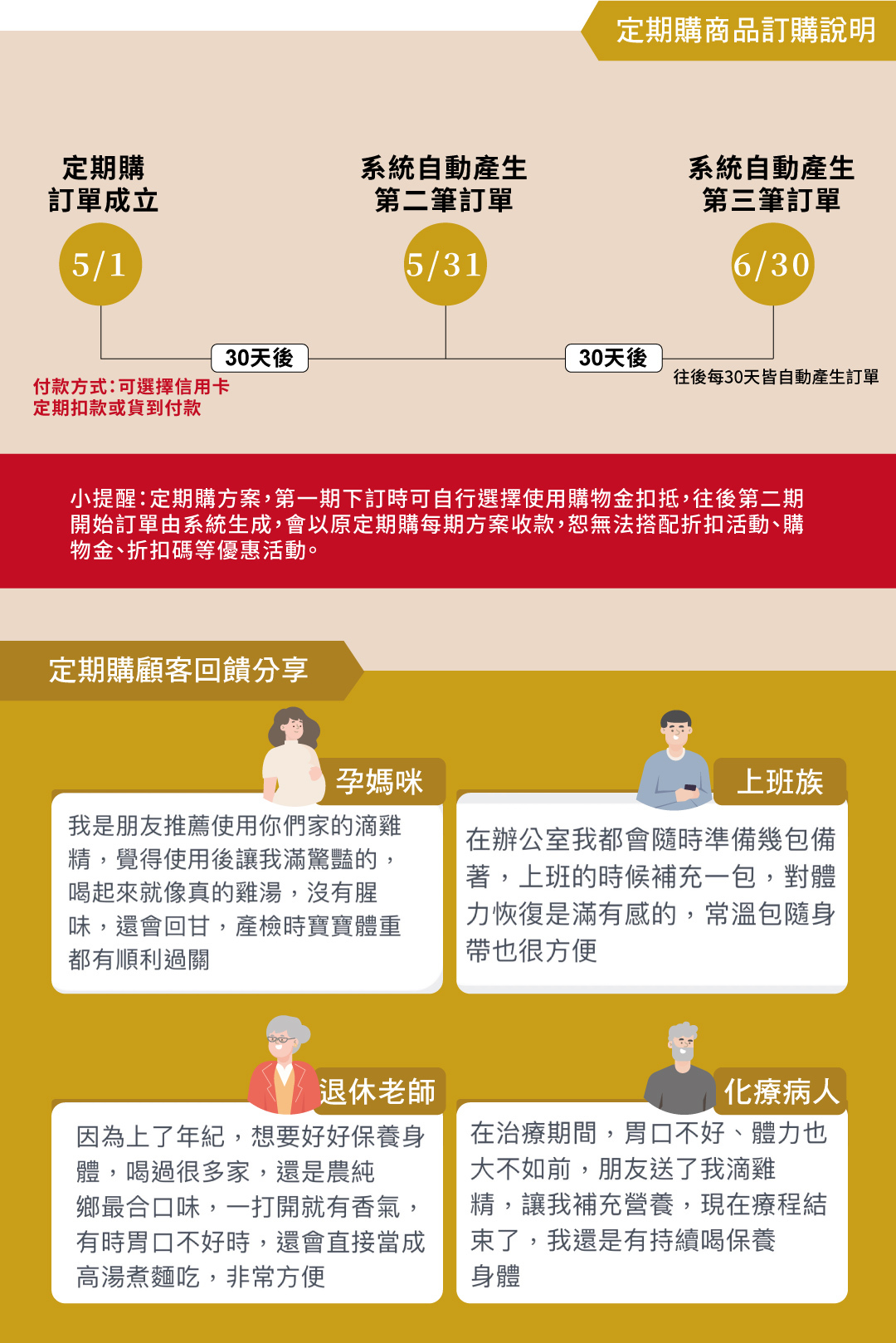 ● 每 30 天自動配送 20 包滴雞精,享台灣本島免運優惠